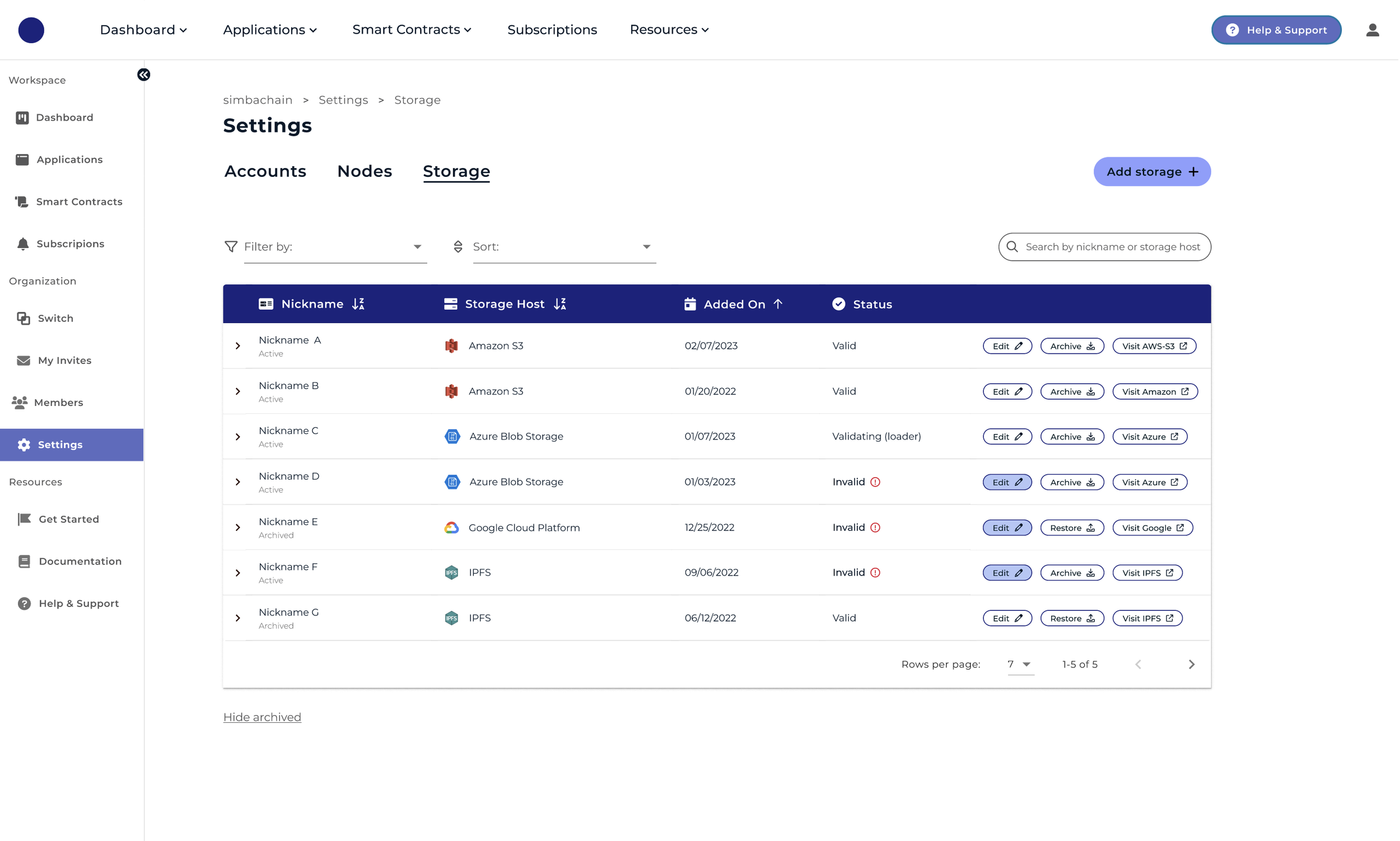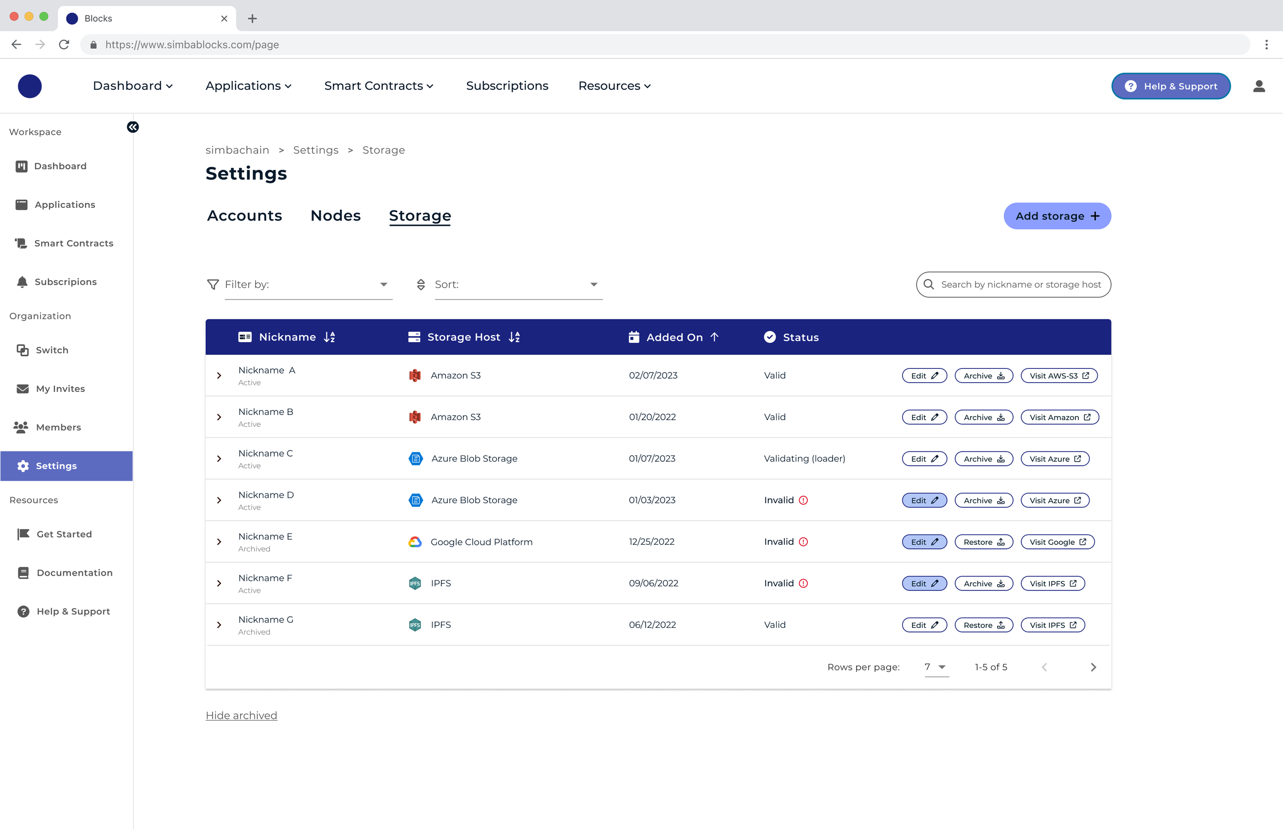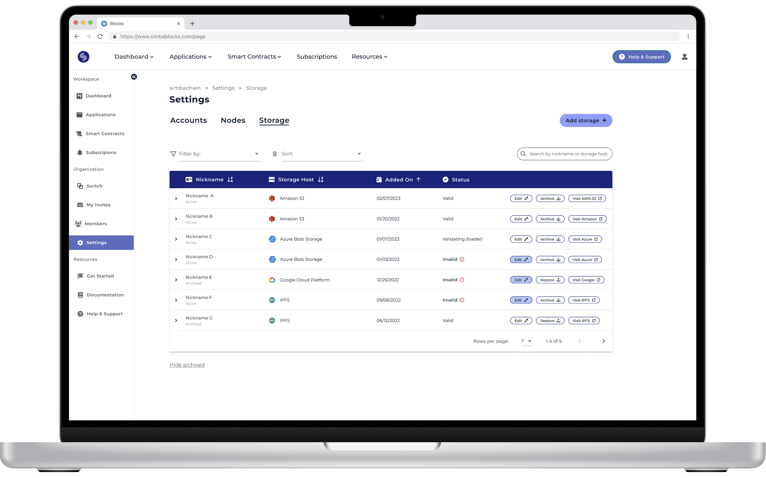 The Bring Your Own Storage feature allows users of the Simba Blocks platform to connect their organization's account to their existing storage solution, allowing them to continue using the storage provider they are already familiar with and have their data stored consistently with their existing infrastructure. This feature also allows users to securely store and manage the credentials for their custom storage solution so that they can access their data without having to enter their credentials every time.